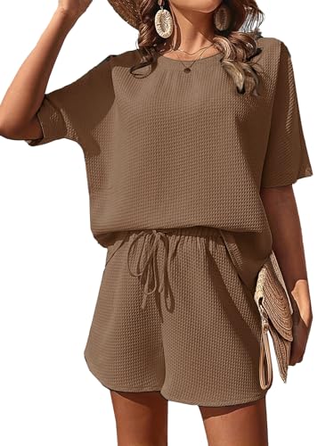 JFAN Set för dam sommar 2-delad kortärmad T-shirt och rund hals enfärgad Bermuda shorts sommar träningsoverall sportig dam chic och elegant, kastanj, L