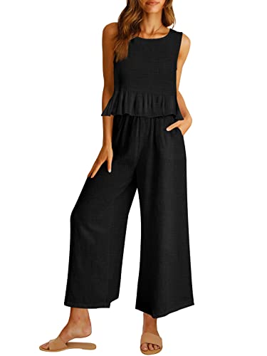AUTOMET Dam sommar 2-delad kläder linne magtröja lounge matchande set och långa byxor träningsoveraller med fickor, Svart, Medium