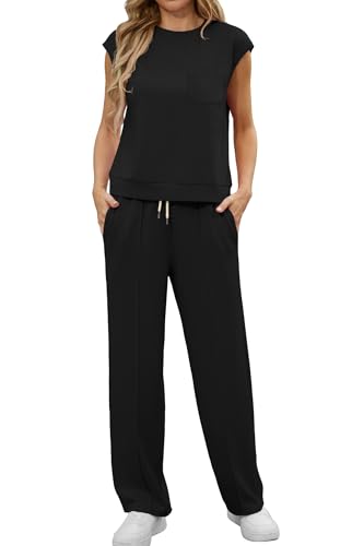 GRECERELLE Tvådelad träningsoverall dam sommarkläder tracksuit kortärmad avslappnad crew neck cap ärmar toppar och joggingbyxor träningsoveraller med fickor, svart, M
