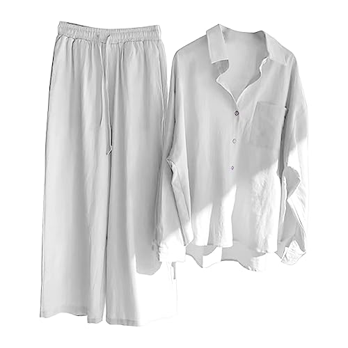 Linne damer träningsoverall set dam vardagskläder set 2 delar nedfällbar krage långärmad blusar toppar och breda ben byxor vardaglig solid myskläder träningskläder med fickor sommarkläder Co Ord Set