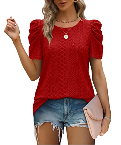 Aokosor Damtoppar för kvinnor T-shirts sommarkläder rund hals t-shirts gigot ärm vardagliga t-tröjor öljett toppar, Röd, XL