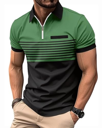 crazy bean Kortärmad pikétröja för herr med dragkedja och V-ringad randig polotröja sommarkläder med falsk kontrast för arbete tennis golf ledig gåva, Grön och svart, XL