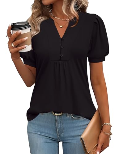 Rapbin Blus, dam, V-ringning, knappslå t-shirt, tunika, kortärmad topp, sommartoppar, elegant, avslappnad, svart, S