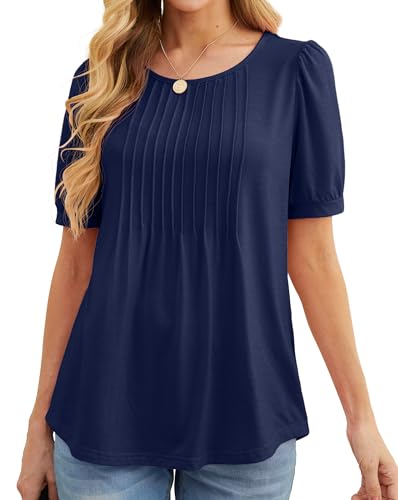 GRECERELLE Dam sommartoppar vardaglig mjuk kortärmad tunika framsida veckad vår rund hals t-shirts lös blus för damer, 01 Marinblå, L