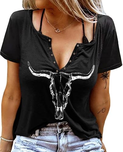 Sxkayxr V-hals T-shirts för kvinnor 2025 landskonsert cowgirlkläder för kvinnor söta sommartoppar grafiska t-shirts t-shirts, En cowskull svart, XL