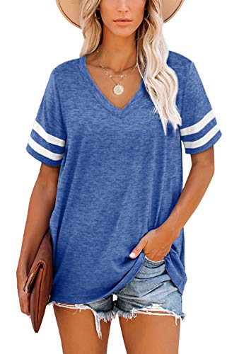 Aokosor Överdimensionerade T-shirts för kvinnor V-ringad damer randig ärm sommartoppar ledig lös tröja, Stil – blå, S