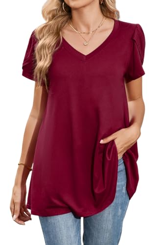Enmain damblusar kortärmad sommartoppar för kvinnor plus size v-ringad lös passform uppklädd tunika toppar vardaglig swing-t-shirt, Vinröd, 3XL