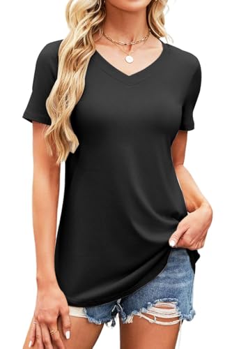 Teesho Dam, lång skjorta, kortärmad t-shirt, V-ringad, sommartoppar, elegant bomullströja, långa toppar, blus, tunika, A-svart, M