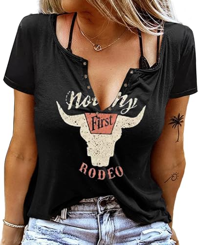 Sxkayxr V-hals T-shirts för kvinnor 2025 landskonsert cowgirlkläder för kvinnor söta sommartoppar grafiska t-shirts t-shirts, A Rodeo svart, S
