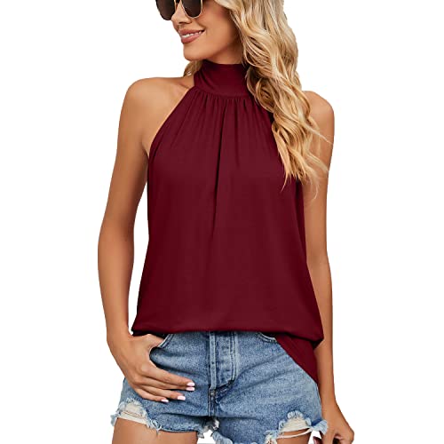 Ärmlösa sommartoppar med halterneck för kvinnor, knytband, veckade, vardagliga, nyckelhål, kami-blusar, Vinröd, S