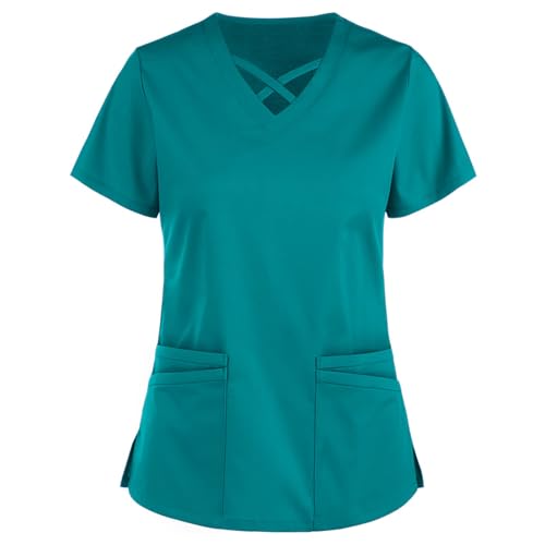 AIGOUT T-shirt för kvinnor kortärmad sommartoppar med fickor tunika uniform för kvinnor UK skönhet frisör massageterapeut spa hälsa arbete skyddande kläder toppar (blå 2, L)
