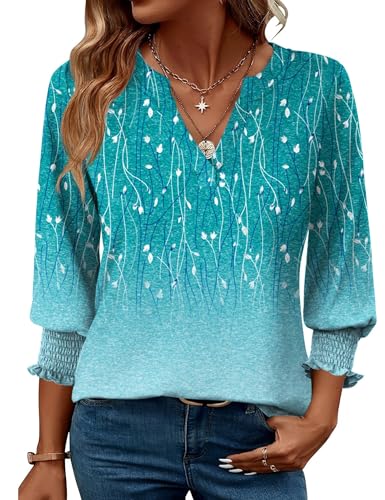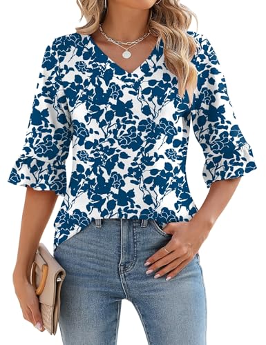 IECCP Damblus, 3/4 ärmar, V-ringad tunika, sommartoppar, långärmad skjorta, elegant lång skjorta, ledig topp 2025 blus, Blå blomma, M