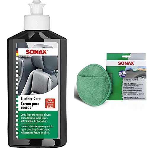 SONAX Lädervårdande Lotion (250 ml) vattenavvisande lädervård med bivax för skonsam rengöring och vård av slätt läder och konstläder | Artikelnummer 02911410 & SONAX Mikrofiber Carepad, Grön
