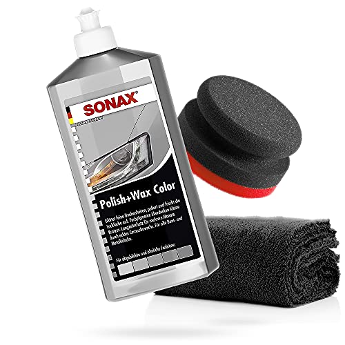 Bilpoleringsset | Sonax Polish & Wax Color svart 250 ml bilpolering poleringssvamp polerduk | Poleringspasta för mörk metalliclack för att ta bort små repor | Poleringsset