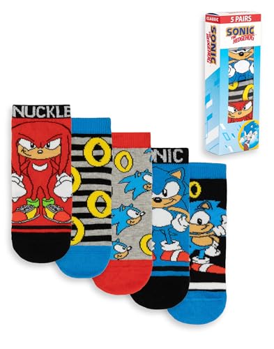 Sonic The Hedgehog barnstrumpor 5-pack | Flerfärgade spelgrafiska skor för pojkar och flickor | Knogar, Sonic & Power Rings speltillbehör | Retro stil varor present till barn, flerfärgad, 9-12