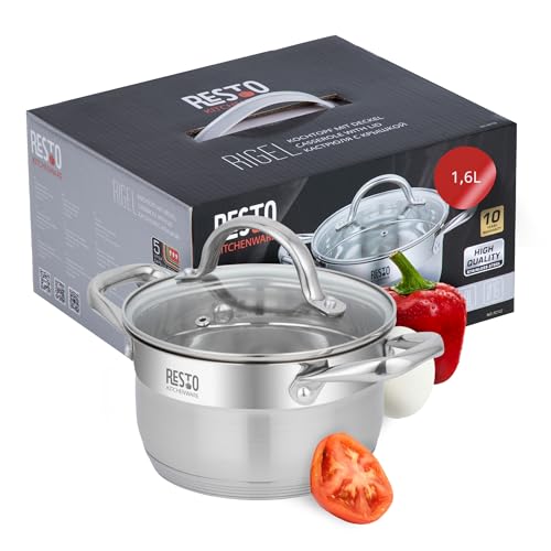 RESTO Rostfritt stål 18/10 kastrull soppgryta stekpanna – för alla typer av spisar – gryta med värmebeständigt glaslock, mätskala i presentförpackning (⌀ 16, h = 9,5 cm, 1,6 l)