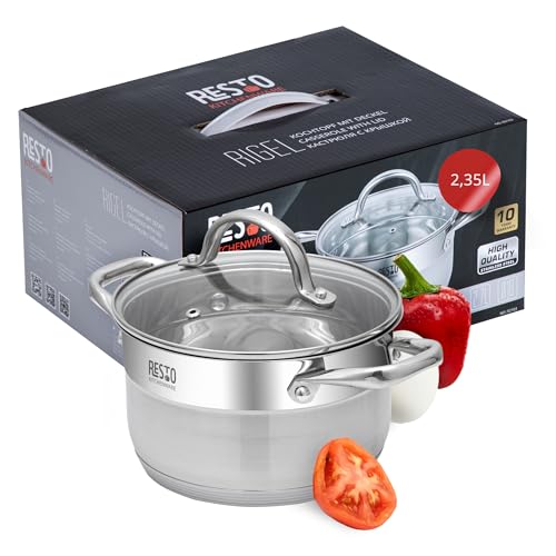 RESTO Rostfritt stål 18/10 kastrull soppgryta stekpanna – lämplig för alla typer av spisar – gryta med värmebeständigt glaslock, mätskala i presentförpackning (⌀18, h = 10,5 cm, 2,35 l)