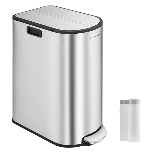 SONGMICS kökssoptunna, avfallssepareringssystem 2 fack, 30 L och 20 L, smal soptunna, pedalkorg för gula påsar och avfall, med 2-delat lock, metallic silver LTB570E50