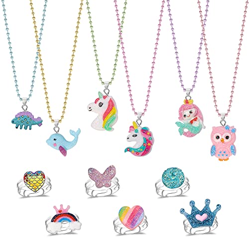 HIFOT 12 delar prinsesshalsband ringar smyckesset småbarn flickor, söt enhörning sjöjungfrur dinosaurie uggla pärlhalsband och justerbara ringar barn lek smycken utklädningstillbehör, Metall, harts