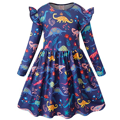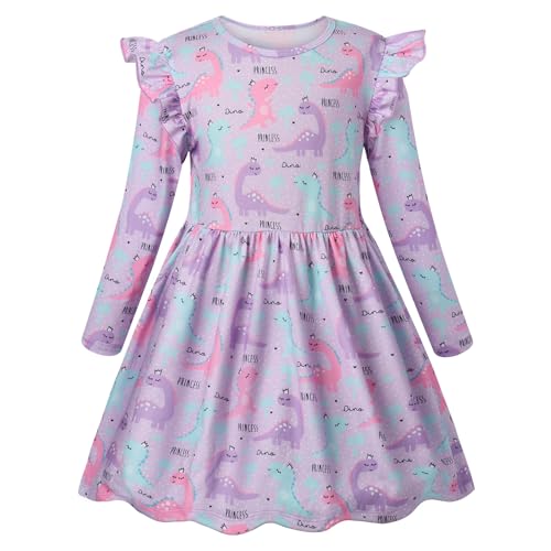 VASCHY Flickklänningar, 3–10 år korta långa ärmar tryck prinsesärmar klänning sött mönster bomull vardagsliv för småbarn barnkläder, Söt dinosaurie-cx118, 5-6 år
