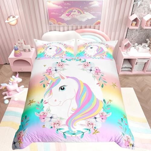 Loussiesd Fantasi enhörning flicka sängkläder enkel färgglad blomma dekor häst täcke set enhörning djur sängar set barn tonåringar kvinnor söt regnfärg enhörning sängkläder 2 st