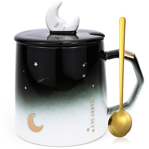 lachineuse - Kawaii kattmugg 450 ml - kattmugg med lock och sked - svart och guld keramisk färg - kaffe- te infusionsmugg - original japansk mugg - presentidé Japan asiatisk kattunge söt