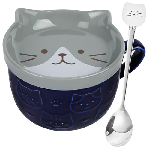 HOTUT Söt keramisk kattkopp, 300 ml keramisk mugg med lock, kaffemuggset, keramisk frukostkopp, semesterpresenter till dotter, son, vänner, familj - blå