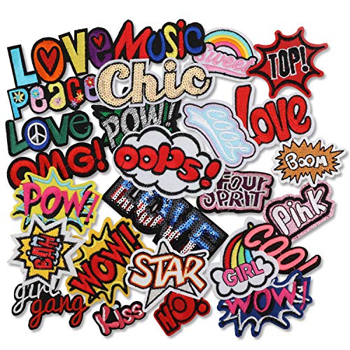 MWOOT Stryk på lappar - 26 st klistermärken, söta ord gör-det-själv kläder lappar klistermärken broderi applikation för sömnad eller strykning för t-shirt jeans kläder väskor