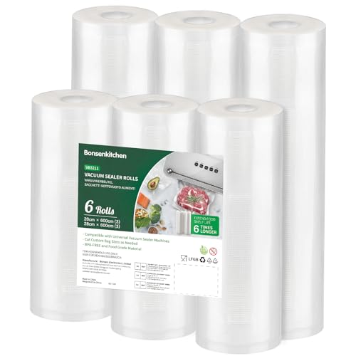 Bonsenkitchen vakuumrullar 3 rullar 28 x 600 cm + 3 rullar 20 x 600 cm vakuumfolie – professionell vakuumpåse för vakuumförpackare livsmedelvakuumförpackare, koksäker och sous vide fryspåsar, BPA-fri,