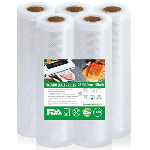 vakuumpåse livsmedel 5 rullar vakuumpåsar, 28 x 300 cm vakuumfolie, BPA-fri, slitstark, 150 µm, vakuumfolierulle för alla vakuumförpackare, mikrovågsugnar, sous vide fryspåse