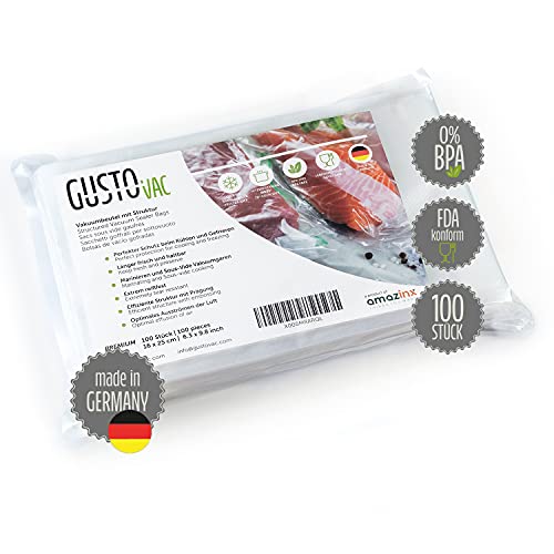 GustoVac Premium vakuumpåse, 100 st. 16 x 25 cm professionell foliepåse, vakuumpåse för vakuumförpackare, koksäker & sous vide fryspåsar, livsmedelsvakuumförpackare, tillverkad i Tyskland, BPA-fri
