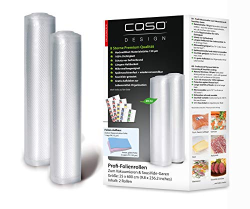 CASO Professionell folierullar 25 x 600 cm/2 rullar, för alla vakuumförpackare, BPA-fria, mycket starka och slitstarka ca 150 µm, doftsäker, koksäker, sous vide, återanvändbar, inkl. Food Manager