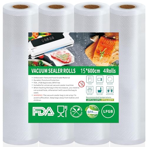 vakuumpåse livsmedel 4 rullar vakuumpåsar, 15 x 600 cm vakuumfolie, BPA-fri, slitstark, 150 µm, vakuumfolierulle för alla vakuumförpackare, mikrovågsugnar, sous vide fryspåse