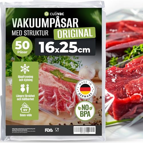 culivac vakuumförpackningar 50 vakuumförpackningar 16 x 25 cm premium, foliepåse för varje foliesvetsmaskin vakuumförpackare, vakuumfolie ”Original” sous vide, tillverkad i Tyskland, BPA-fri