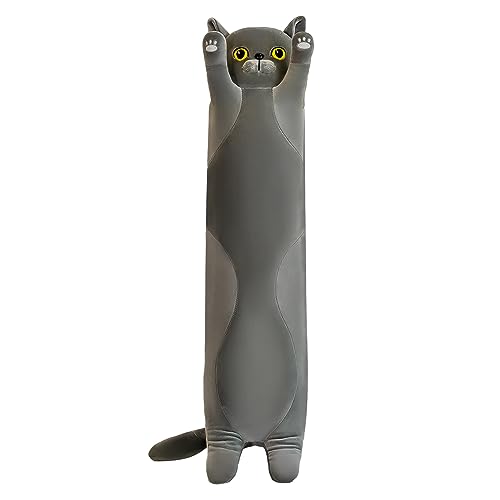 Plyschkudde i form av en lång, söt katt, fylld prydnadskudde, sovkudde, prydnadskudde för barn, flickvänner och vuxna (70, grå)