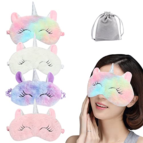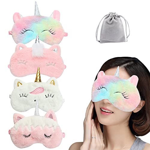 4 st söt sovmask, enhörning tecknad ögonmask för resor tupplur sömn lunchpaus övernattningsfest, mjuk plysch ögonbindel ögonskydd för kvinnor flickor barn
