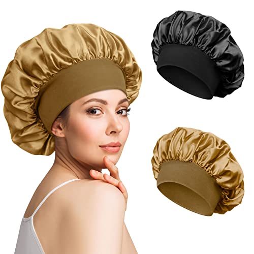 2 stycken sovmössor satin bonnet natt sovmössa justerbar sovmössa huvudbonad mjuk huvudbonad sovmössa silke med elastiskt band för kvinnor och flickor, Svart, guld, 40 à 58 cm