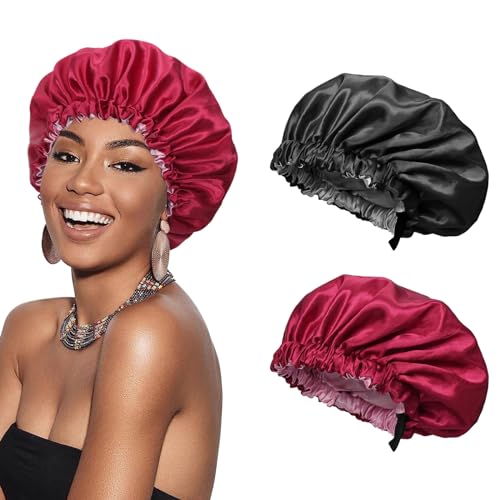 Euqvunn 2 Stycken Sovmössa I Silke, Justerbar Med Bred Elastisk Band Sovmössor Av Satin, Tvåfärgad Dubbelansikts, Passar För Nattlig Sömn, Skydd För Långt/Rakt/Lockigt Hår (Svart Röd)