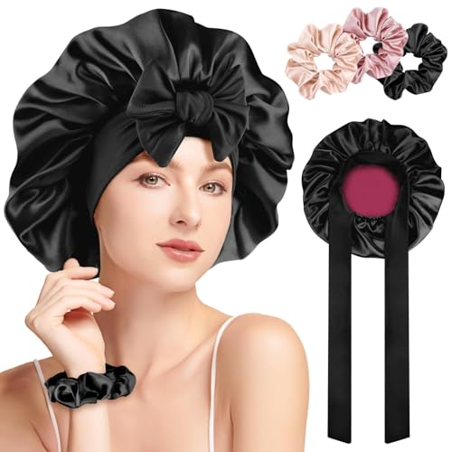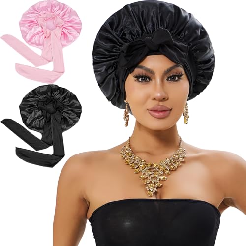 BONNET QUEEN Satin Sovhuvor för Damer Silkesmössa för Sovande Kvinnor, Stor Satin Sovmössa med Justerbart Huvudband för Lockigt, Svart