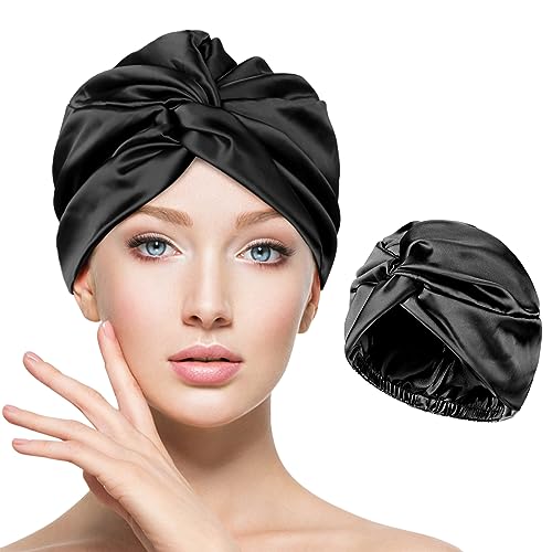 Kiiwah Sidenmössa för sömn, sovmössa för kvinnor, satin, bonnet, sovmössa, siden, supermjuk konstsiden, hårvård, nattmössa med gummiband för kvinnor och flickor (svart)