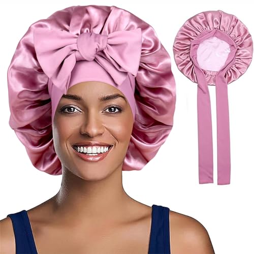 BONNET QUEEN Satin Sovhuvor för Damer Silkesmössa för Sovande Kvinnor, Stor Satin Sovmössa med Justerbart Huvudband för Lockigt, Rosa