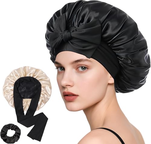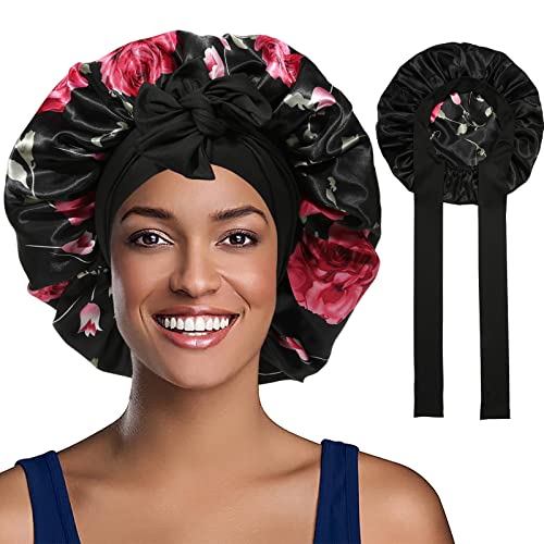 Awefeel Dubbelskikts satin sovmössa för långt hår, flätor, dreadlocks, lockigt hår, Medium svart, M