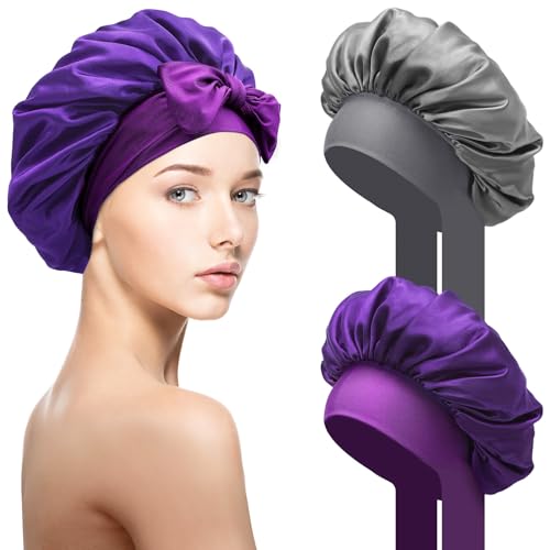 SOMLAW 2 stycken silkeshuva för att sova sovmössa, hårskydd i satin, hårmössa med elastiskt band, mjuk nattmössa för lockigt hår, sovmössa, satin, bonnet för kvinnor, Ljusgrå, lila, one size