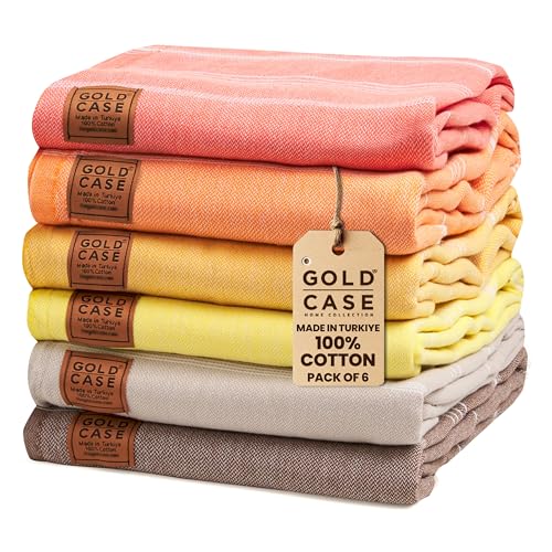 GOLD CASE - Uppsättning av 6 XXL 178 x 99 tum - LYCIA turkiskt bad, strandhandduk - 100 % naturlig bomull snabbtorkande pestemal för strand, spa, pool, gym, yacht, picknick, badrum, hamam (gula orangea toner)