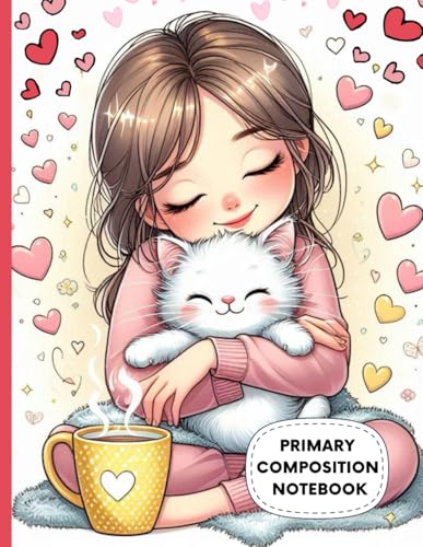 Cute Girl with Cat Primary Composition Notebook: Adorable Cat Lover Kids Writing Journal | Wide Ruled with Drawing Space | Handwriting Practice Book | Ages 4–8 | 8.5 x 11 in, 120 Pages