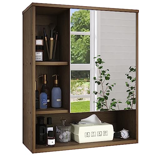 SMIBUY Badrumsspegelskåp Väggmonterat, Bambu Space Saver Medicine Skåp, Vägghängande över toalettförvaringsskåp med spegeldörr och justerbar hylla (valnöt)