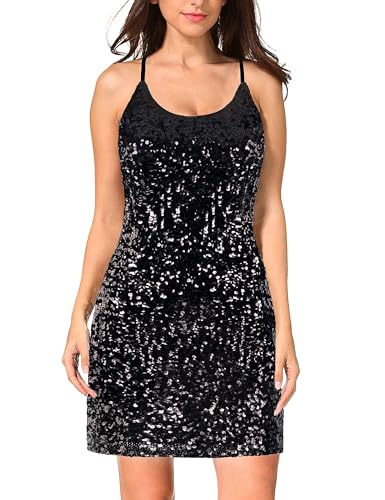 MANER Women's Glitter Sequin Dress Adjustable Spaghetti Strap Sparkle Party Dresses (Black, Small)