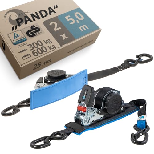 valonic PANDA - 2x 5m automatisk spännband med karbinhake, 25mm, 300/600 Kg, vadderade, TÜV Rheinl. / GS certifierad, EN-12195-2 - med spärrlås, svart