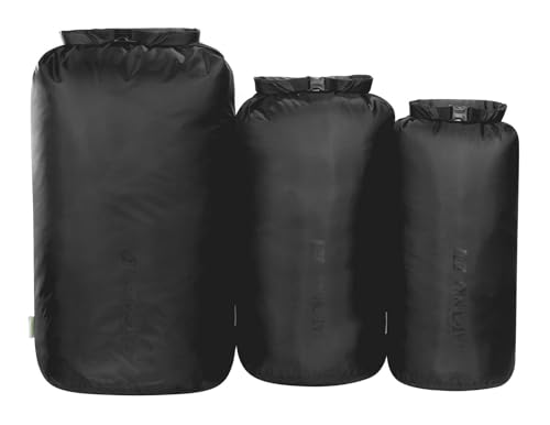 Tatonka förpackningspåsar Dry Bag Set 3 (10 l/18 l/30 l) – tre vattentäta packpåsar med rullstängning och spänne – tillverkade av återvunnen polyester – 10, 18 och 30 liter volym (svart)