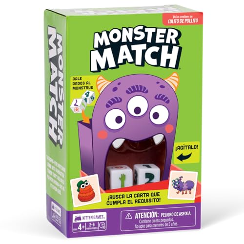 Exploding Kittens Monster Match, Kortspel för barn från 4 år, hitta det kort som uppfyller kravet, 2 till 6 spelare, 10 minuter per spel, spanska